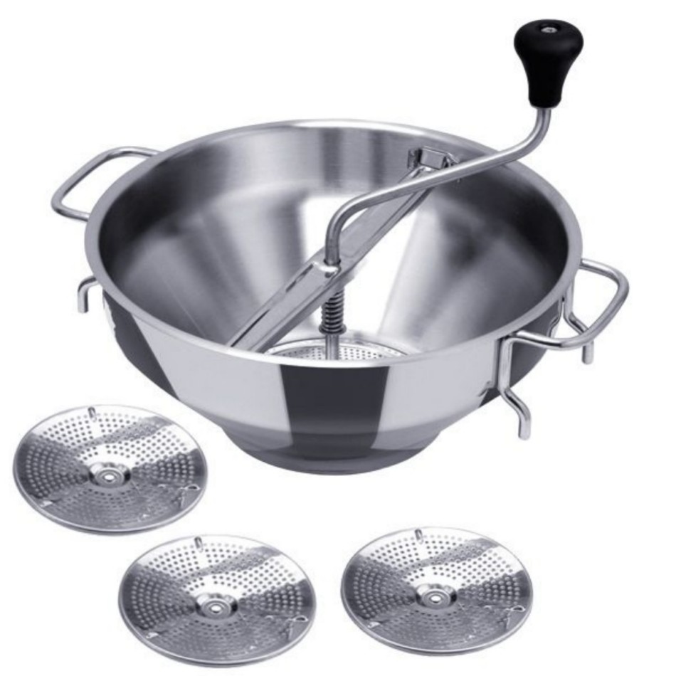 Profesionální pasírka se třemi vyměnitelnými disky. Průměr 26cm. Objem pasírky 5l. Materiál nerez 18/10.
