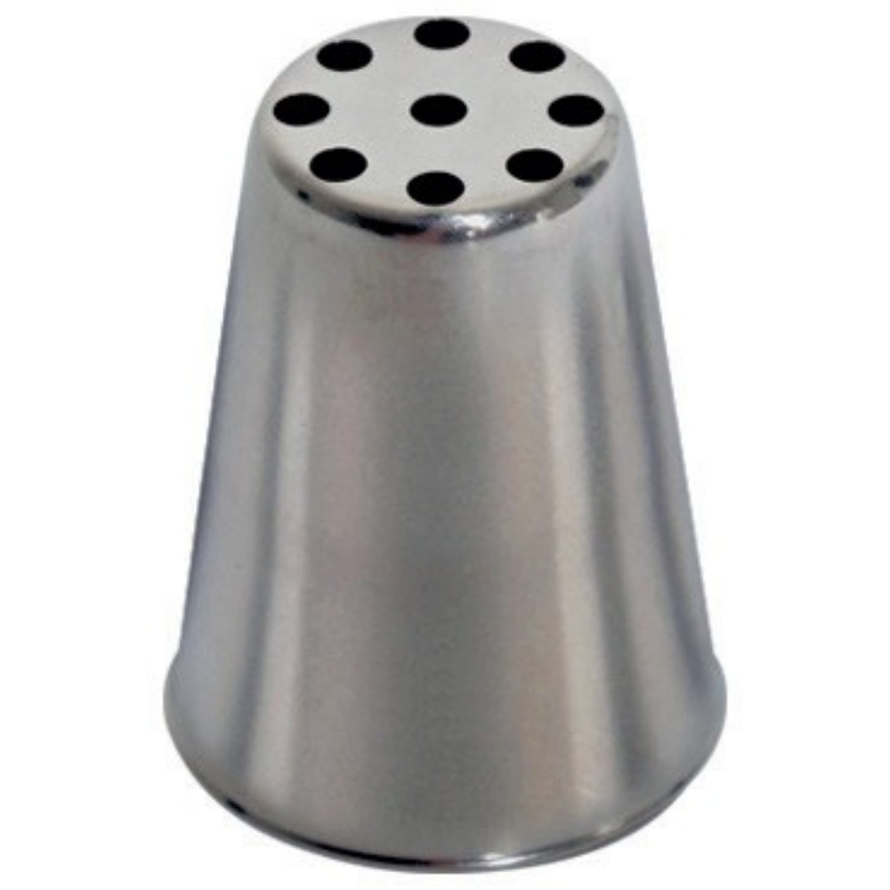 Klasický pomocník pro zdobení dortů, zákusků a pohárů vyrobený z nezávadné nerezové oceli. Koncovka či špička je výrobkem francouzského specialisty firmy de Buyer. Koncovka je tvořena 7 otvory o průměru 1,3mm.